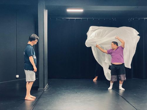 Virginie Marouzé sympathise avec Clément Papachristou, artiste associé au Théâtre National, lors d’une rencontre au sujet des pratiques artistiques inclusives. Une collaboration germe. « Nous avons mis en place un échange de pratiques. Clément a proposé d’y participer en duo avec Edouardo della Faille qui participe à la création de son prochain spectacle, Justice. »